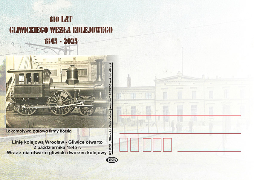 Klub Zainteresowań PZF "Gliwicki Klub Kolekcjonerów" wyemitował kartkę okolicznościową z okazji przypadającej w br. 180 rocznicy powstania Gliwickiego Węzła Kolejowego.