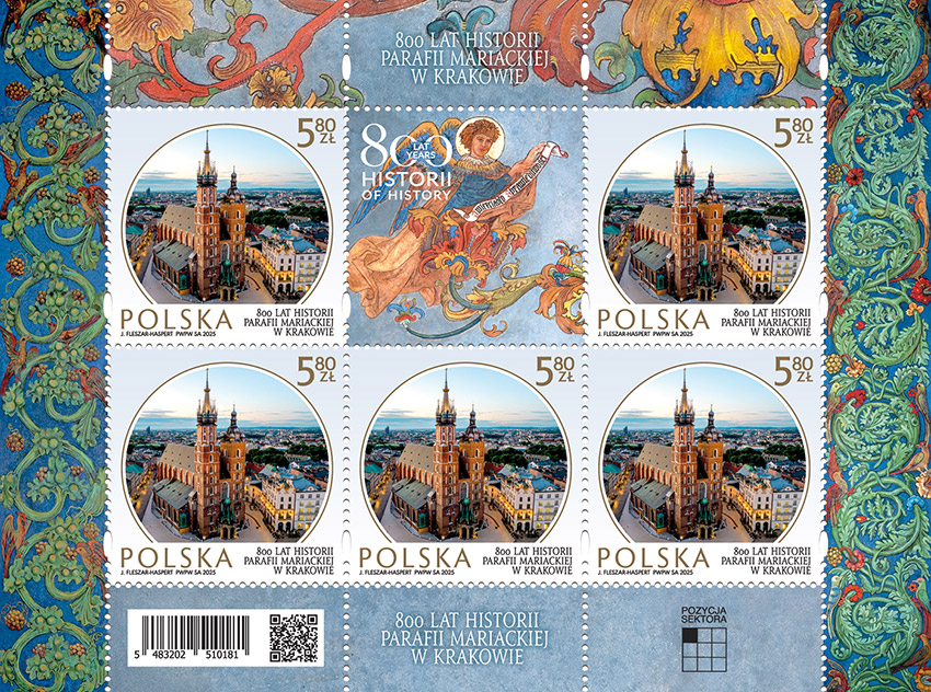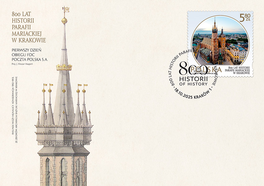 18 października 2025 roku do obiegu wchodzi znaczek pocztowy o wartości 5,80 zł, na którym przedstawiono fotografię Bazyliki Mariackiej na tle panoramy Krakowa, na przywieszce - polichromię autorstwa Jana Matejki z prezbiterium Bazyliki Mariackiej oraz oficjalny logotyp obchodów 800-lecia parafii Mariackiej.