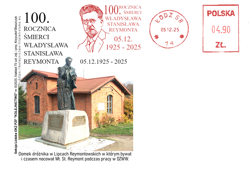 Przewidziane są koperty okolicznościowe na których pokazano fotografię domku dróżnika, w którym bywał i czasem nocował Władysław Stanisław Reymont kiedy był pracownikiem DŻWW. Odbitki listem zwykłym wykonywane będą na kopertach zwykłych białych lub okolicznościowych. Każdy kto chce otrzymać frankaturę może zamówić ją na zwykłej białej kopercie w cenie 6 zł/szt, lub na kopercie okolicznościowej w cenie 8 zł/szt. Odbitki frankatury listem poleconym będą wykonywane tylko na białych kopertach w cenie 9,50 zł/szt. (brak miejsca na kopercie okolicznościowej na e-R-kę). Można również nadesłać zaadresowane koperty formatu C6 do ofrankowania okolicznościową nakładką. Jest możliwość odesłania frankatur w liście zwrotnym, tak by nie narazić koperty z frankaturą na uszkodzenie w transporcie, wówczas proszę doliczyć do zamówienia 9,50 zł na zwrotny list polecony i kopertę. Porto frankatur zgodne z cennikiem poczty tylko w obrocie krajowym. Zamówienia które mają być wysłane na zagraniczne adresy realizowane będą tylko w kopertach zwrotnych, przesyłki zgodnie z cennikiem Poczty Polskiej (list priorytetowy nierejestrowany 15 zł, list polecony priorytetowy 24 zł). W przypadku wątpliwości proszę pytać o koszt realizacji zamówienia. Zrealizowane zostaną wszystkie zamówienia nadesłane do 02.12.2025 r., korespondencję do ofrankowania proszę kierować na adres: