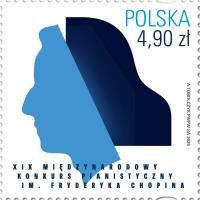 XIX Międzynarodowy Konkurs Pianistyczny im. Fryderyka Chopina 2025.09.25. 19:55 (9594) 2 października 2025 roku do obiegu wchodzi znaczek pocztowy o wartości 4,90 zł, na którym przedstawiono oficjalną grafikę XIX Międzynarodowego Konkursu Pianistycznego im. Fryderyka Chopina.